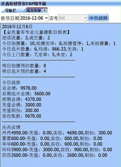影楼财务工作者会有这样的感觉:随着每个月发放工资那天的到来,他们的工作强度明显加大,同工同酬、同工不同酬、多人共享某一提成、活动非活动期间不同的提成比例,有些价位单子算业绩不算提成,摄影师是否享有充值业绩、后期加选业绩等,还有更多的业绩计算可能性不再一一列举,如果纯粹的靠纸质单子或者简易手工表格,面对计算业绩发放工资,工作量和难度不是一般的大,这里向影楼财务工作者致敬。