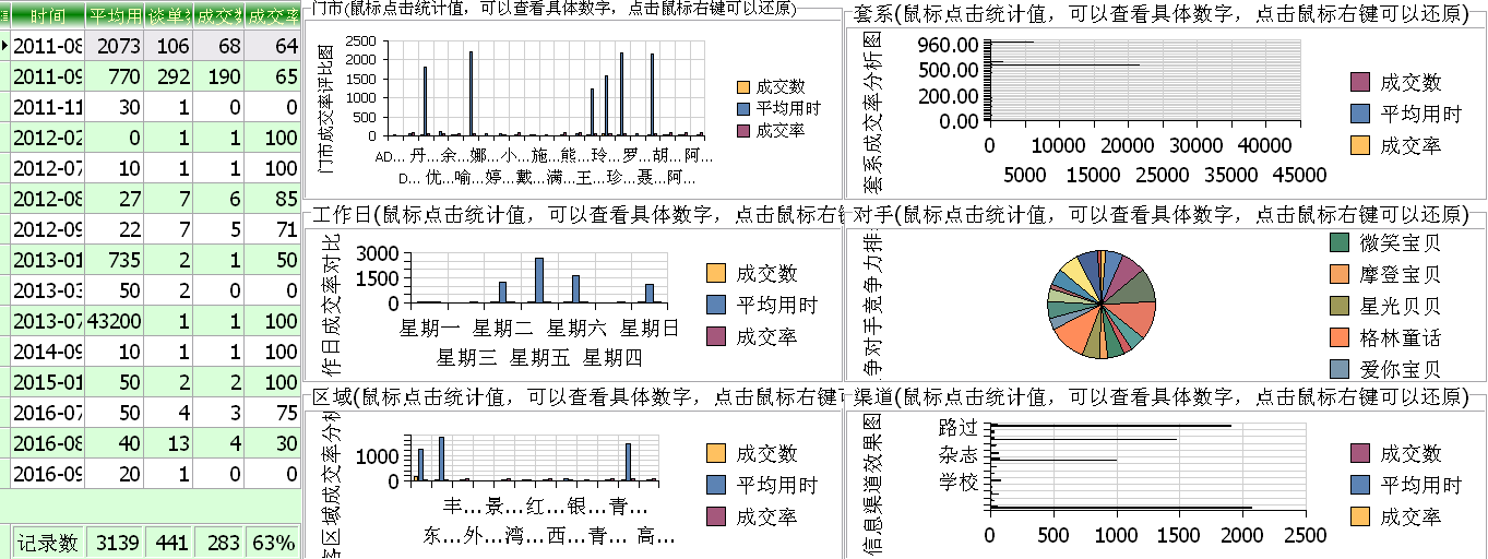 如此丰富的业务模式下,不管是连锁店经营者还是自主开店创业者,往哪个方向发力成了他们非常关心的重要因素,彦鑫软件提醒您:如果平时做了精细化管理,您将可以一键获取极具价值的信息—哪个方向哪种渠道是当前主要客源、可以再接再厉,哪个方向是薄弱环节,需要补足短板,什么价位的套系是最畅销的,哪些门市战斗力爆棚,哪些工作日成交较好等等。在一个窗口多维度分析前期成交状况,为管理者做决策定向提供丰富的支持。下面仅以彦鑫软件演示数据来做个效果展示: