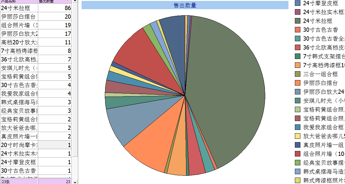 没有什么比为自己影楼精准定位当地市场更让影楼管理者放心的事了,精准把控哪种套系哪些产品是最适合所在地市场,不仅可以促进销量、提升口碑、提高满意度,它甚至决定了一家影楼是否能够健康有序、循序渐进的发展,恰到好处的套系组合及价位,大受欢迎的畅销产品,一定程度上可以潜移默化的带动顾客进行自发的转介绍。如何能够清晰精准的了解到哪种套系、什么产品最受欢迎呢,依然是看大数据,统计图风格类似,下图仅从产品分析角度作效果展示: